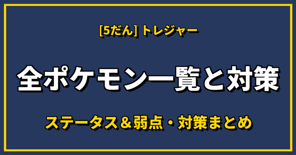 【5だん】★4(トレジャー)全ポケモン一覧弱点とわざを一覧にまとめました!詳細を知りたい場合はボタンをタップしてください。ジャローダZわざエンブオーZわざダイケンキZわざアラブルタケスナノケガワテツノワダチテツノドクガエルレイドテラスタルブリ...